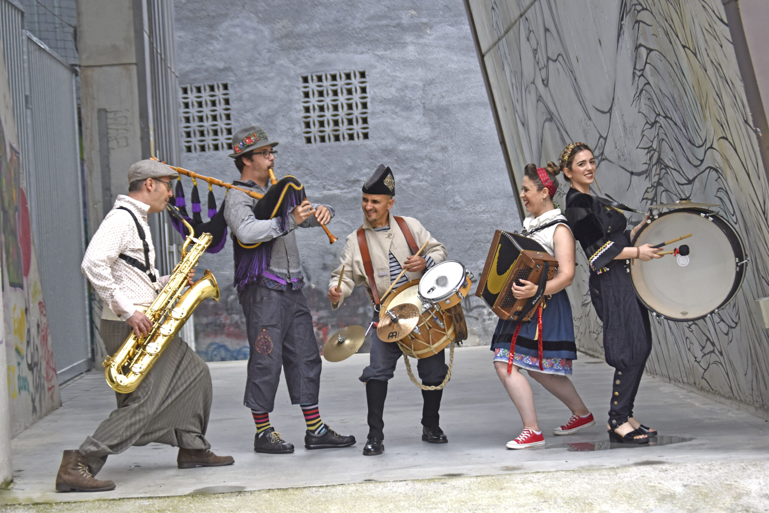 A un lado Bretaña, al otro Asturies y, en medio, cinco músicos viajeros que invitan a compartir un encuentro donde las tradiciones se entrelazan con naturalidad. La Banda… Latira! es una fanfarria enloquecida que traslada al público de una orilla a otra del Atlántico, entre ritmos enérgicos y melodías que despiertan los sentidos. Su espectáculo, tan cuidado como vibrante, es un viaje de una hora donde composiciones y temas tradicionales se fusionan con delicadeza. Expresión corporal, caracterización y puesta en escena convierten cada actuación en una experiencia única, pensada para todos los públicos. En calles, plazas o festivales, los músicos crean atmósferas que atrapan, donde las multitudes se animan y se dejan llevar. Su vestuario, tan creativo como sus interpretaciones, refleja el alma de dos culturas que se buscan y se encuentran en un mismo latido. Han llevado su música a grandes festivales como Lorient, Quimper, Villaviciosa, Avilés o Quebec, dejando su huella allá donde el mundo se hace casa. Danzad con ellos, seguid sus ritmos trashumantes. ¡Uníos a la fiesta, cada uno a su aire!