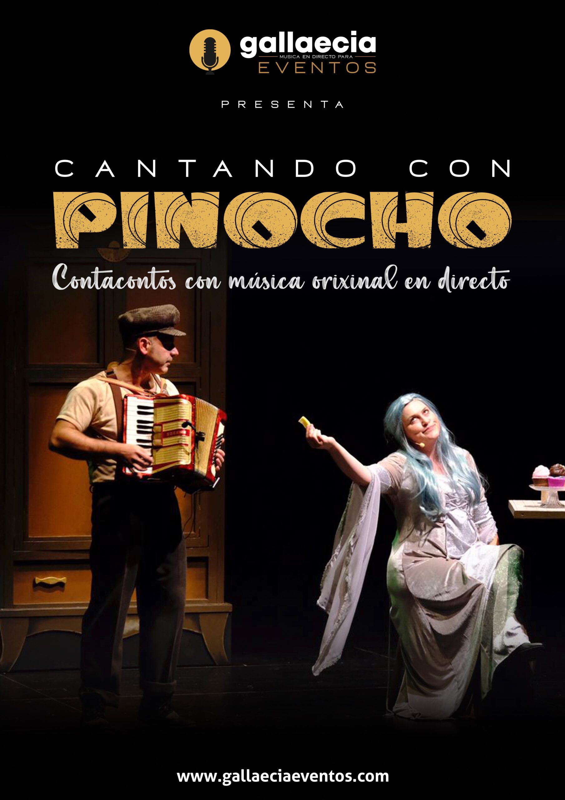 Cuentacuentos con música en directo de acordeón y piano. El Hada de Cabellos Turquesa y Pepino, amigos de Pinocho, contarán el cuento de Pinocho que se intercalará con canciones, efectos sonoros y música en directo. Integra canciones originales compuestas para la ocasión que hablan sobre el amor, alimentos, la libertad, la dignidad, nanas…