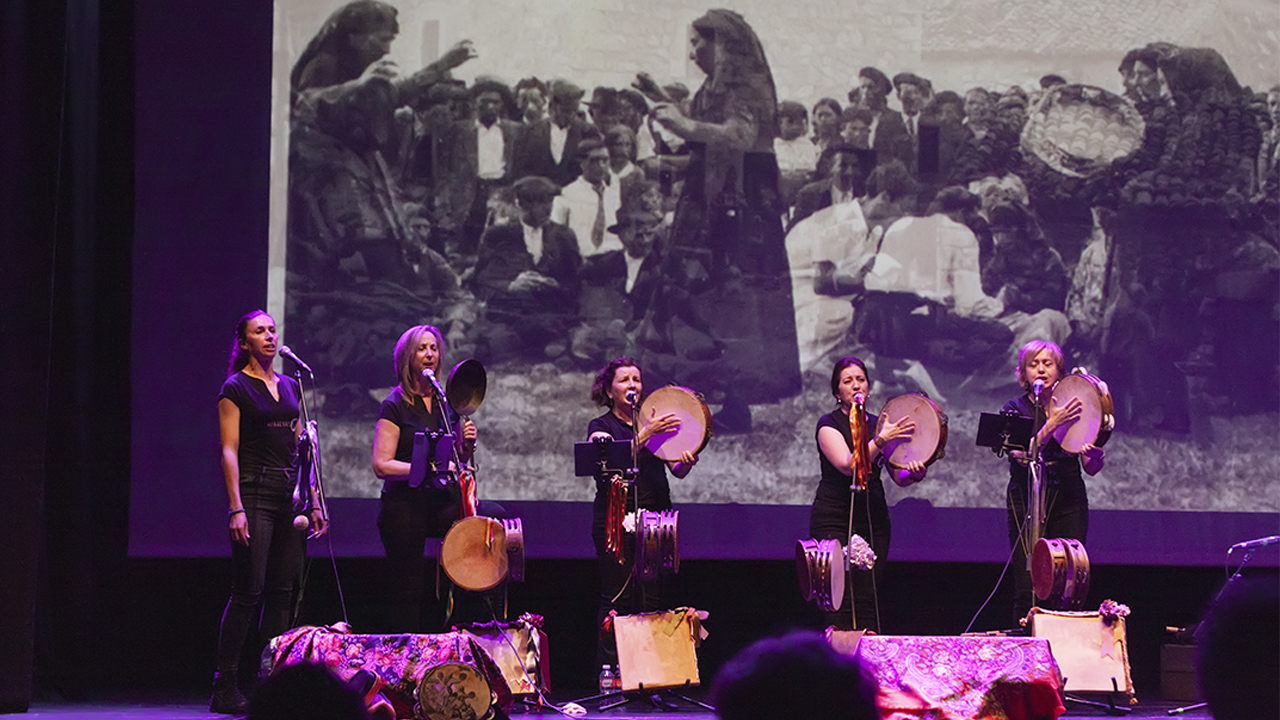 El papel de la mujer en la transmisión de la cultura oral fue muy importante en la sociedad. La organización de baile recaía en las mozas, de entre ellas las más veteranas, que eran las encargadas de buscar el lugar, de fijar el momento y de dar aviso por el pueblo y alrededores. Las mujeres iban aprendiendo unas de otras los toques y cantares para acompañar el baile y utilizaban para ello panderos, panderetas o lo que tuvieran a mano para tocar. Estas mujeres, con sus coplas que improvisaban con plena libertad, sobre personas que conocían, sobre la vida diaria del pueblo, sus quehaceres y costumbres e incluso sobre hechos históricos importantes del momento, o sin narrar nada en particular, se convirtieron así en verdaderas cronistas de la época. ‘Contar Cantando’ se basa en el legado de estas mujeres, utilizando sus canciones, hace un recorrido por la geografía y la historia de nuestra región. Es un proyecto vivo, respetando un esquema inicial algunas canciones pueden variar dependiendo de motivo del evento o a quién vaya dirigido en cada momento. Cada pieza del repertorio se acompaña de una explicación. Para el Grupo Compañeras es muy importante poner al público en situación para que comprenda lo que está escuchando, utilizando también, siempre que es posible, un video.